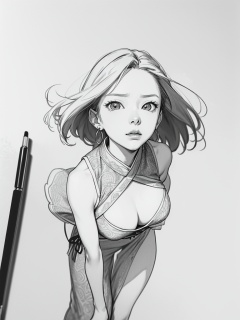 ((Character Sketch XCYP), (Black and White Pen and Ink Drawing: 2.0), High Abstract, Minimalist Style, Thick Lines, Smooth Lines, Clean, Perfect Composition, High Contrast, Strong Black and White Contrast, Masterpiece, Award-Winning Piece, Best Quality, Masterpiece, 8K, High Resolution.)perfect hand."One Piece" [serious: 1girl,boa_hancock,1girl,waistband,hanfu,solo,earrings,large_breasts,looking_at_viewer,standing split,hands on own hips:0.1], masterpiece, best quality,