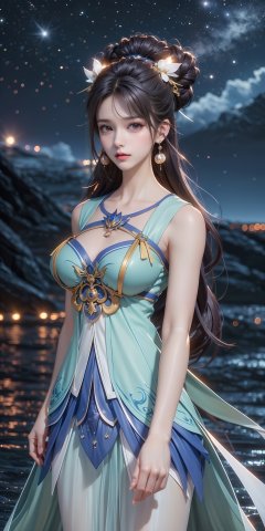 <lora:CE_20240228222732-000006:0.75>,CE,scenery,sky,night,outdoors,light particles,star \(sky\),horizon,bokeh,blurry,night sky,cloud,starry sky,depth of field,1girl,jewelry,upper body,(close-up:1.1),hair bun,solo,black hair,dress,hair ornament,earrings,bracelet,blue eyes,anklet,looking at viewer,long hair,forehead mark,high_heels,chinese clothes,dress,hair rings,<lora:MHB:0.2>,<lora:HDR:0.5>,, (raw photo:1.2),((photorealistic:1.4))best quality,masterpiece,illustration,an extremely delicate and beautiful,extremely detailed,CG,unity,8k wallpaper,Amazing,finely detail,masterpiece,best quality,official art,extremely detailed CG unity 8k wallpaper,absurdres,incredibly absurdres,huge filesize,ultra-detailed,highres,extremely detailed,beautiful detailed girl,cinematic lighting,1girl,pale skin,tall female,(perfect body shape),skinny body,Slender legs,, (Cowboy shot,Distant view,telechoto:1.1)