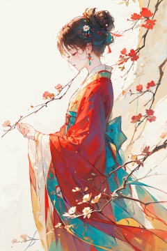 1girl, solo, brown hair, black hair, hair ornament, long sleeves, dress, jewelry, closed mouth, standing, closed eyes, flower, earrings, wide sleeves, hair bun, from side, profile, chinese clothes, red dress, single hair bun, own hands together, branch, hanfu