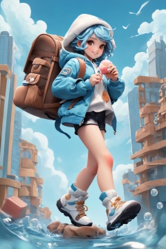 1girl, backpack, cloud, sky, outdoors, blue hair, day, bag, building, shorts, jacket, water, long sleeves, holding, food, blue sky, standing, shoes, skyscraper, looking at viewer, bird, tree, boots, full body, hood, hat, solo, personification, white footwear, smile, holding food, blue jacket, brown eyes, bubble, bangs, city, cloudy sky, sneakers, candy, black shorts, parted lips, short hair