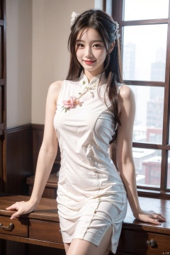 (Masterpiece, best quality), shape, super detailed, 8K, very detailed, colorful details, meticulous texture, a stunning girl wearing a qipao, long hair, big breasts, perfect style, body, 18 years old, smile