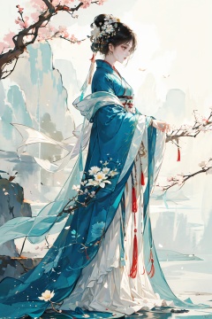 1girl, solo, black hair, hair ornament, long sleeves, dress, jewelry, closed mouth, standing, full body, flower, hair flower, wide sleeves, white dress, profile, looking away, chinese clothes, white flower, shawl, stairs, branch, hanfu