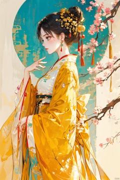 1girl, solo, breasts, black hair, hair ornament, long sleeves, dress, jewelry, closed mouth, standing, earrings, indoors, hand up, wide sleeves, hair bun, from side, tree, profile, chinese clothes, single hair bun, branch, bare tree, yellow theme, hanfu