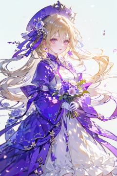 1girl, bangs, blonde_hair, blue_flower, blue_rose, bouquet, bow, breasts, dress, eyebrows_visible_through_hair, floating_hair, floral_background, flower, gloves, hair_between_eyes, hat, hat_ribbon, holding, holding_bouquet, holding_flower, hydrangea, long_hair, looking_at_viewer, mob_cap, puffy_short_sleeves, puffy_sleeves, purple_dress, purple_flower, purple_rose, red_bow, red_eyes, red_ribbon, ribbon, ribbon-trimmed_sleeves, ribbon_trim, rose, short_sleeves, simple_background, smile, solo, very_long_hair, white_background, white_flower, white_gloves, white_headwear, wind, yakumo_yukari, guoflinke
