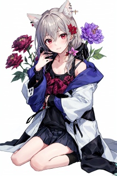 1girl, solo, long hair, looking at viewer, blush, bangs, skirt, simple background, shirt, black hair, red eyes, long sleeves, animal ears, hair between eyes, bare shoulders, sitting, closed mouth, collarbone, jacket, flower, open clothes, sleeveless, wide sleeves, black skirt, grey background, coat, head tilt, hands up, piercing, own hands together, ear piercing, purple flower, wrist scrunchie, erune<lora:EMS-324093-EMS:0.700000>