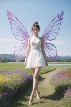 1girl,white dress,short skirt,(very long legs:1.1),(legs apart:1.2),tattoo,nebula,(painted clothes:1.3),standing,(transparent wings:1.3),high heels,high ponytail hanging down to the shoulders,lake,flowers,flowers meadows,grasslands,day,sunny sky,outdoors,<lora:Again_Style_2:1>