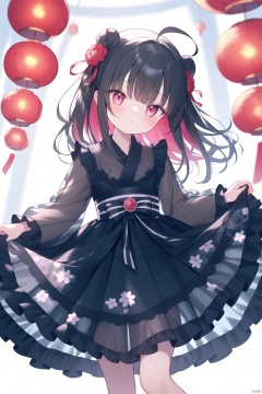 1girl, loli, dress, flower printed, black hair, black dress, heteromonic, dynamic angle, lolita dress, see through, multi layered dress, bangs, ahoge, from sude, multi_colored hair, kimono,, long sleeves, masterpiece, best quality, blurry background, depth of field, onnk