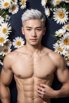 masterpiece,best quality,fenhong,1boy,white hair,pectoral fuse,surrounded by flowers,fill with flowers,daisy,topless,, masterpiece,best quality,