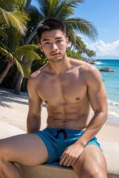 1boy,man,sitting,palm tree,beach,nude,shorts,masterpiece,best quality,<lora:man_face_v1.0:1.2>,, masterpiece,best quality,