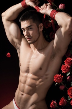 1male,muscular,((rose)),(vine),bandage,red rope,(detail light),falling rose petals,, masterpiece,best quality,