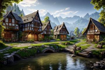 (masterpiece:1.2), (best quality,:1.2), 8k, HDR, ultra detailed, ((photorealistic)), professional light, cinematic lighting, fashion photography, ambient lighting,<lora:detail_slider_v4:2.5>, a small medieval fantasy village at a river, FanSe, DarkFantasy, <lora:FantasySettlement-10:1>, epiCPhoto