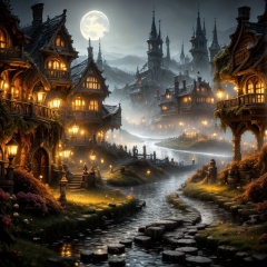 (masterpiece:1.2), (best quality,:1.2), 8k, HDR, ultra detailed, ((photorealistic)), professional light, cinematic lighting, fashion photography, ambient lighting,<lora:detail_slider_v4:2.5>, background, a medieval town at a lake, moonlight, fog, FanSe, DarkFantasy, <lora:FantasySettlement-10:1>, epiCPhoto