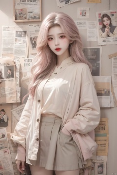 1girl, solo, long hair, looking at viewer, skirt, shirt, standing, jacket, pink shirt, pink hair, newspaper, newspaper wall, lips, wall, gray wall, newspaper are covered with walls, put one hand in pocket, body close to the wall, sleeves past wrists, grey eyes, red lips, mjuanlian, (/qingning/), (\ji jian\), (/qingning/), (\meng ze\)