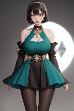Realistic style, cinematic work, 8K wallpaper, masterpiece, very realistic quality, best quality, masterpiece, high-level, high-resolution,,,Edge lighting, dual tone lighting, soft lighting, The illuminated surface of the material has bright spots and highlights, which flicker and have a mirror effect when reflected, There are sparkling spots on the armor,,,1 girl, mature female, solo, full body, looking at viewer, lace, strong rim light, Standard proportion of female body, golden proportion of female body,,,Standing, standing posture, Sexy full body standing posture,,,,(huajia1, 1girl, black hair, ahoge, blue eyes, short hair, bangs, blush, breasts, large breasts, bare shoulders, dress, pantyhose, ridal gauntlets, jewelry, brown pantyhose, ring, mole, detached sleeves, wide sleeves, halterneck, green dress,:1.2),,bare shoulders, off shoulder, black hairband, bikini bottom only, short dress, swimsuit, pleated dress, bikini, floating hair, blush, ass visible through thighs, skirt,White high-heeled shoes,:1.2),,,colorful,(detailed skin: 1.3), (detailed face: 1.3),clear focus,delicate,(mature women: 1.2),(glossy skin+glossy skin: 1.4),(sweating: 1.1),(big_eyes),red_ eyeshadow,long_ Eyelashes, red lips,,,simple background, grey background,,,(Diamond hair accessories, diamond necklaces, diamond earrings, diamond earrings, clothes embedded with diamonds, armor embedded with diamonds,:1.3),, huajia1<lora:EMS-324556-EMS:0.400000>