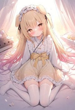 white thighhighs, frilled thighhighs, flower printed, shamed, blush,magical, [[breasts]], looking at viewer, sleeves past wrists, two side up, ribbons, full body, bow, open dress, see through, , sunlight, yellow dress, frilled hairband, half closed eyes, closed mouth, , looking at viewer,, toys, white flower, kimono, white gloves, frills thighs, head tilt, masterpiece, best quality, onnk, sunlight