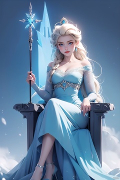 bingxuex\(ip\), 1girl, elsa \(frozen\), solo, dress, blue eyes, blonde hair, long hair, throne, sitting, blue dress, staff