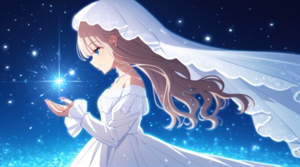 (best quality), ((masterpiece)), (highres), illustration, original, extremely detailed,  <lora:好き物语:0.7>1girl, solo, veil, blue eyes, long sleeves, long hair, dress, white dress, bangs, off-shoulder dress, profile, off shoulder, from side, closed mouth, smile, jewelry, blue background, upper body, hands up, bridal veil, sleeves past wrists, bare shoulders, puffy sleeves, wedding dress, necklace
