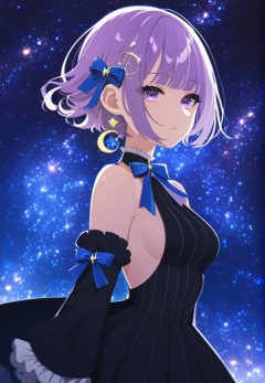 (best quality), ((masterpiece)), (highres), illustration, original, extremely detailed,  <lora:好き物语:0.7>1girl, solo, dress, black dress, detached sleeves, breasts, purple eyes, star \(sky\), sideboob, short hair, jewelry, sky, earrings, starry sky, bangs, black sleeves, ribbon, looking at viewer, virtual youtuber, frills, blue ribbon, crescent earrings, crescent, night, purple hair, frilled sleeves, closed mouth, bow, bare shoulders, neck ribbon, long sleeves