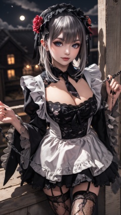 tutututu,1girl,solo,Kuroe Shizuku,lolita fashion,apron,pantyhose,gothic lolita,black dress,frills,hair flower,hair ornament,chain leash,black nails,wide sleeves,lace trim,long sleeves,rose,black footwear,black necktie,maid,fishnets,maid headdress,detached collar,red flower,thighhighs,hairband,chain,floral print,lolita hairband,garter straps,black thighhighs,lace,<lora:Kuroe Shizuku_Lolita-000007:0.5>,masterpiece, best quality,1girl, (colorful),(finely detailed beautiful eyes and detailed face),cinematic lighting,bust shot,extremely detailed CG unity 8k wallpaper,white hair,solo,smile,((flying petal)),(Flowery meadow)sky, cloudy_sky, building, moonlight, moon, night, (dark theme:1.3), light, fantasy,