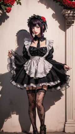 tutututu,1girl,solo,Kuroe Shizuku,lolita fashion,apron,pantyhose,gothic lolita,black dress,frills,hair flower,hair ornament,chain leash,black nails,wide sleeves,lace trim,long sleeves,rose,black footwear,black necktie,maid,fishnets,maid headdress,detached collar,red flower,thighhighs,hairband,chain,floral print,lolita hairband,garter straps,black thighhighs,lace,<lora:Kuroe Shizuku_Lolita-000007:0.5>,1girl,solo,full body,a captivating young woman. Emphasize her striking red hair and mesmerizing green eyes. Create intricate floral hair ornaments,showcasing a harmonious blend of diverse blooms. Surround her with a lush,immersive floral background,rich in detail and vivid hues,providing an ethereal atmosphere. Ensure the composition exudes beauty,grace,and the essence of a blooming garden,flower dress,