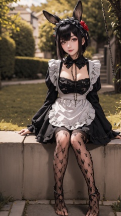 tutututu,1girl,solo,Kuroe Shizuku,lolita fashion,apron,pantyhose,gothic lolita,black dress,frills,hair flower,hair ornament,chain leash,black nails,wide sleeves,lace trim,long sleeves,rose,black footwear,black necktie,maid,fishnets,maid headdress,detached collar,red flower,thighhighs,hairband,chain,floral print,lolita hairband,garter straps,black thighhighs,lace,<lora:Kuroe Shizuku_Lolita-000007:0.5>,1girl,solo,animal ears,rabbit,barefoot,knees up,sitting,rabbit ears,short sleeves,looking at viewer,grass,short hair,smile,white hair,outdoors,,bangs,on ground,full body,animal,white dress,sunlight,brown eyes,dappled sunlight,day,depth of field,