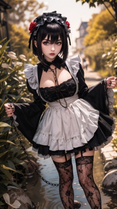 tutututu,1girl,solo,Kuroe Shizuku,lolita fashion,apron,pantyhose,gothic lolita,black dress,frills,hair flower,hair ornament,chain leash,black nails,wide sleeves,lace trim,long sleeves,rose,black footwear,black necktie,maid,fishnets,maid headdress,detached collar,red flower,thighhighs,hairband,chain,floral print,lolita hairband,garter straps,black thighhighs,lace,<lora:Kuroe Shizuku_Lolita-000007:0.5>,***** Alice in wonderland standing in stream,large mushrooms in background,highly detailed,Beautiful lighting,photoreal,4k,depth of field,night scene,light from godrays shining on ground,