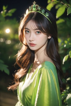 eli,1girl,RAW photo, pretty female green Celtic druid unique and magical phenomenon where the leaves surround them are not ordinary leaves but mirrors reflecting green light, mesmerizing patterns, fragments glow with a neon green light, surreal and enchanting. The druid's eyes are a captivating neon green, night, Landscape portrait photography angle, green neon detailed flowing robes. red hair, crown of leaves, green halo, night, dynamic lighting, hdr lighting, dynamic range, 4K, 8K, high,Fujifilm XT3, Canon R5, Fujicolor Fujichrome Velvia 100 detail, clear face, clear face, intricate detail, photorealism