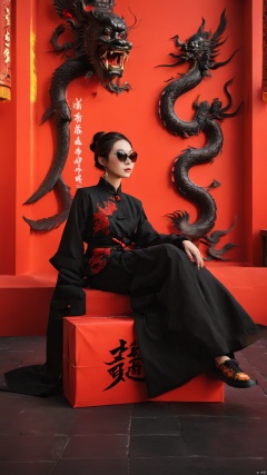 A stylish person exuding confidence in a textured black outfit and cool sneakers, striking a dynamic pose with hand gestures, accentuated by unique, ornate sunglasses. They are seated against an intense red background, rich with oversized Chinese characters, symbolizing cultural depth. Flying red envelopes and glowing traditional lanterns animate the scene, lending a festive and lively air to the composition. This scene captures a fusion of modern style with traditional Asian motifs, highlighted by a striking color palette and bold attitude, best quality, ultra highres, original, extremely detailed, perfect lighting