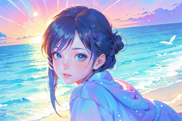 dream, masterpiece, best quality, highres, ultra high res, anime, 1 girl, evening, backlight, looking at viewer, outdoor, details eyes, details lips, beach, wallpaper forced,seagull, watercolor \(medium\)