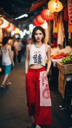 A portrait of a fashion-forward young woman with shoulder-length ombre hair and large hoop earrings. She wears a cropped white **** top paired with striking red trousers featuring Asian calligraphy and traditional designs. Around her neck, a chic necklace adds to her stylish ensemble. She stands poised in the middle of a lively street market, its neon lights creating an energetic yet moody atmosphere, blurred in the background to draw attention to her. The scene captures an urban, contemporary street style with a hint of traditional Asian influences, executed with perfect lighting and a shallow depth of field for a cinematic feel, best quality, ultra highres, original, extremely detailed, perfect lighting