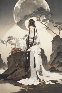 best quality, masterpiece, 8k, ultra high res, (photorealistic:1.4), highly detailed, intricate detail, delicate and beautiful, good lighting, professional lighting, sharp focus, detailed shadows, exquisite details and textures, depth of field, unity 8k wallpaper,1girl,night, huge full moon, outdoor, Hanfu, full body, courtyard, branches, flowers, grass,(black and white ink painting:1.8)