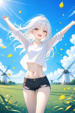 (masterpiece),(best quality),illustration,ultra detailed,hdr,Depth of field,(colorful),1girl,solo,outdoors,shorts,sky,long hair,cloud,navel,falling leaves,cutoffs,arms up,crop top,smile,grass,windmill,midriff,day,black shorts,long sleeves,floating hair,stomach,wind,blue sky,standing,open mouth,shirt,short shorts,denim,white hair,white shirt,yellow eyes,:d,torn shorts,feet out of frame,looking at viewer,denim shorts,leaf,thighs,