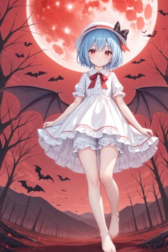 (masterpiece), (best quality), illustration, ultra detailed, hdr, Depth of field, (colorful),loli,inely detailed, Depth of field, masterpiece, extremely detailed CG unity 8k wallpaper, best quality, high resolution illustration, Amazing, intricate detail, best illumination, best shadow, an extremely delicate and beautiful, レミリア・スカーレット, full_moon, red moon, night, outdoors, blood, bare_tree, Blood red sky, bat swarm, remilia_scarlet, Remilia Scarlet, 1 loli, 9 years old, little girl, ribbon, Blue Hair, short hair, disheveled hair, bat wing, DECAYING BAT WINGS, White Dress, red_moon, wings, solo, bloomers, hat_ribbon, barefoot, red_eyes, looking_at_viewer, evil ghost