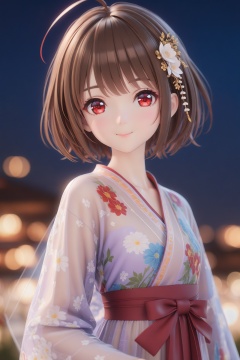 (masterpiece),(best quality),illustration,ultra detailed,hdr,Depth of field,(colorful),mmd,night,1girl,solo,red eyes,looking at viewer,hair ornament,short hair,upper body,brown hair,blurry,ahoge,bangs,see-through,depth of field,hanfu,smile,floral print,closed mouth,