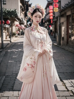 <lora:5152_7227_8405@f7b698da35:0.7>,solo,1girl,zanhua,china_dress,chinese_style,plump,looking at viewer,light_blush,absurdres,realistic,available light,depth_of_field,gohei,street,light_eyes,
