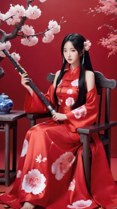 1girl, solo, long hair, black hair, dress, twintails, sitting, weapon, flower, barefoot, chair, chinese clothes, plant, china dress, red background, vase,best quality, ultra highres, original, extremely detailed, perfect lighting