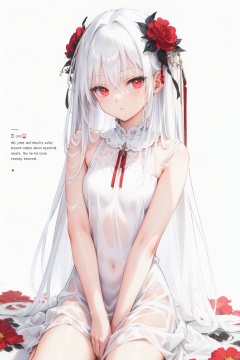 1girl, loli, red eyes, white long translucent night gown, expressionless, (white hair), hair cover one eye, long hair, red hair flower,blood, (white background:1.5), (English text),sit on the ground