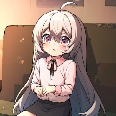 HDR,UHD,best quality,Highly detailed,masterpiece,Professional,<lora:linlin:1>,linlin,1girl,long hair,shirt,solo,ahoge,grey hair,skirt,collared shirt,pink shirt,long sleeves,bangs,ribbon,blush,hair between eyes,very long hair,indoors,sitting,neck ribbon,facing viewer,loli,female child,