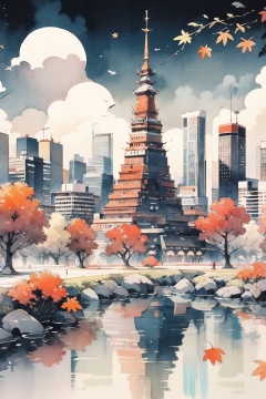 watercolor_(medium),maple_leaf,red,magnificent_architecture,city,