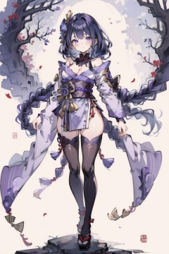 ((HRD, HUD, 8K)),((masterpiece, best quality)), highly detailed,YuanShen, 1girl, solo, raiden shogun, breasts, japanese clothes, thighhighs, purple eyes, long hair, purple hair, kimono, hair ornament, braid, full body, bangs, cleavage, looking at viewer, obi, mole, sash, simple background, wide sleeves, mole under eye, braided ponytail, long sleeves, black thighhighs, shoulder armor, closed mouth, tassel, purple kimono, smile, medium breasts, flower, armor, standing, blush, ribbon, thighs, very long hair, single braid, bridal gauntlets, <lora:20240318-1710771192163:0.9>
