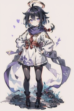 ((HRD, HUD, 8K)),((masterpiece, best quality)), highly detailed,YuanShen, 1girl, solo, paimon (genshin impact), black scarf, scarf, hands on hips, black hair, ahoge, boots, long sleeves, looking at viewer, bangs, full body, dress, closed mouth, white dress, blue eyes, standing, blush, halo, simple background, cape, hair between eyes, grey background, purple eyes, <lora:20240318-1710771192163:0.9>