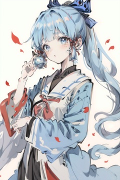 ((HRD, HUD, 8K)),((masterpiece, best quality)), highly detailed,YuanShen, 1girl, kamisato ayaka, solo, long hair, mole under eye, ponytail, blue eyes, mole, bangs, petals, ribbon, hair ribbon, red ribbon, parted lips, looking at viewer, simple background, blue hair, bow, blunt bangs, long sleeves, blue bow, wide sleeves, tress ribbon, falling petals, hand up, sidelocks, hair bow, <lora:20240318-1710771192163:0.9>