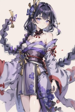 ((HRD, HUD, 8K)),((masterpiece, best quality)), highly detailed,YuanShen, 1girl, solo, raiden shogun, purple eyes, breasts, long hair, mole under eye, japanese clothes, braid, purple hair, mole, kimono, cleavage, looking at viewer, obi, bangs, hair ornament, sash, flower, simple background, wide sleeves, purple kimono, bare shoulders, long sleeves, medium breasts, ribbon, sketch, <lora:20240318-1710771192163:0.9>