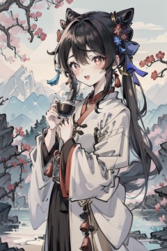 ((HRD, HUD, 8K)),((masterpiece, best quality)), highly detailed,YuanShen, 1girl, hu tao (genshin impact), flower-shaped pupils, symbol-shaped pupils, boo tao (genshin impact), smile, red eyes, long hair, flower, holding, plum blossoms, open mouth, looking at viewer, hair ornament, long sleeves, sidelocks, brown hair, bangs, tassel, ghost, solo, outdoors, alternate hairstyle, chinese clothes, hair flower, hair between eyes, hair bun, blush, wide sleeves, :d, mountain, sash, alternate costume, standing, twintails, black hair, cup, red flower, black nails, star-shaped pupils, holding cup, hanfu, bowl, cowboy shot, <lora:20240318-1710771192163:0.9>