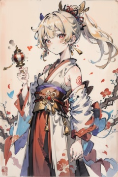 ((HRD, HUD, 8K)),((masterpiece, best quality)), highly detailed,YuanShen, 1girl, yoimiya (genshin impact), orange kimono, japanese clothes, solo, sarashi, kimono, blonde hair, tattoo, chest tattoo, holding, hair ornament, hadanugi dousa, arm tattoo, traditional media, bandages, red eyes, sash, obi, looking at viewer, jewelry, single bare shoulder, breasts, bangs, off shoulder, standing, ponytail, chest sarashi, bandaged arm, earrings, flower, <lora:20240318-1710771192163:0.9>