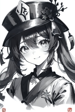 ((HRD, HUD, 8K)),((masterpiece, best quality)), highly detailed,YuanShen, 1girl, hat, hu tao (genshin impact), monochrome, smile, solo, symbol-shaped pupils, looking at viewer, greyscale, long hair, flower-shaped pupils, simple background, twintails, white background, bangs, hair between eyes, flower, grin, portrait, signature, porkpie hat, <lora:20240318-1710771192163:0.8>