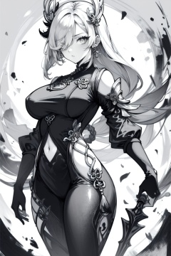 ((HRD, HUD, 8K)),((masterpiece, best quality)), highly detailed,YuanShen, 1girl, shenhe (genshin impact), breast curtain, solo, greyscale, monochrome, long hair, weapon, braided ponytail, breasts, braid, gloves, bodysuit, holding weapon, clothing cutout, shoulder cutout, holding, hip vent, polearm, tassel, hair ornament, looking at viewer, bangs, holding polearm, hair over one eye, covered navel, tassel earrings, large breasts, very long hair, black bodysuit, partially fingerless gloves, puffy sleeves, <lora:20240318-1710771192163:0.8>