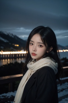 (Not looking at the audience: 1.5),scarf,portrait of 1girl by Bill Henson,Black Cashmere coat,masterpiece,best quality,highres,2girls,flora,snowing,bokeh,low contrast,sharp and in focus,(art by Chris Friel:1.2),(night),sad,melancholy,drillhair,wind,cinematic_angle,(cinematic tone:1.2),mountaintop,cowboy shot,floating hair,rule of thirds,ice lake, 1girl
