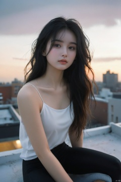 NSFW,Frontal photography,Look front,evening,dark clouds,the setting sun,On the city rooftop,A 20 year old female,Black top,Black Leggings,black hair,long hair, dark theme, muted tones, pastel colors, high contrast, (natural skin texture, A dim light, high clarity) ((sky background))((Facial highlights)),,