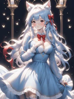 1girl, multiple colored hairs,hair,lovely,cute,whole bodyblue bow,animal ears, red eyes, long hair, very long hair, long sleeves, solo, bow, hair between eyes, bangs,dress, legwear,white hair, chest,pray,Cleavage of breast